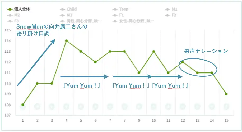 【10秒目以降】これまでの向井さんの呼びかけではなく、別の男声ナレーションで商品紹介コメントを挿入:向井康二さんのセリフが挿入されるのではという期待感を裏切る意外性を醸成することができたからか?終盤まで高い注視を維持することができた。 |