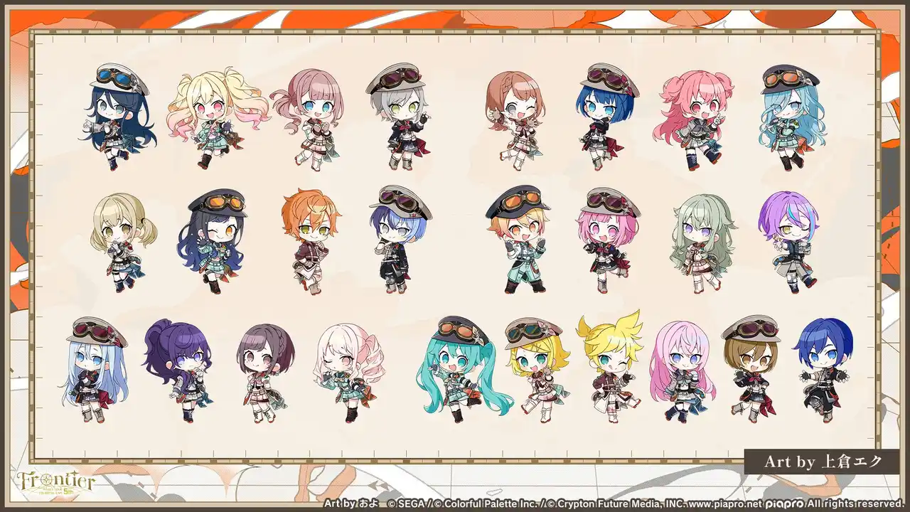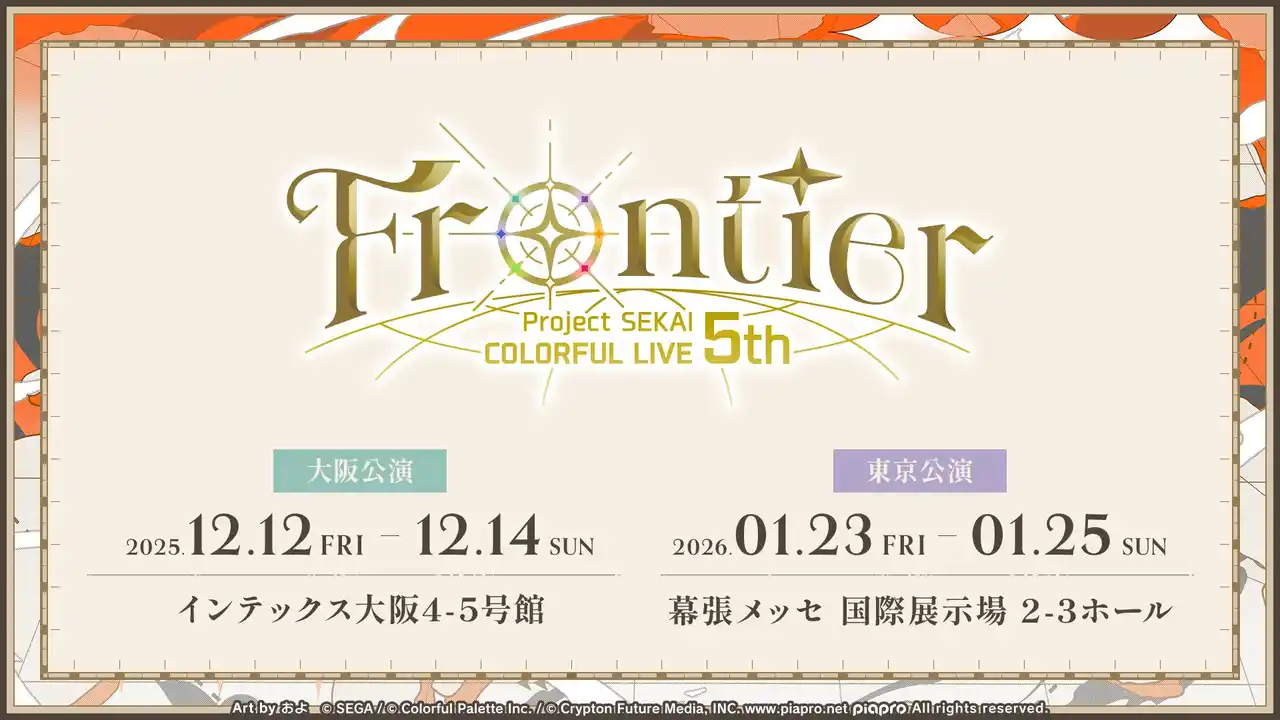 『プロジェクトセカイ』のキャラクターたちが出演する3DCGライブ「プロジェクトセカイ COLORFUL LIVE 5th - Frontier -」の開催が決定いたしました。大阪公演は2025年12月12日(金)~14日(日)にインテックス大阪にて、東京公演は2026年1月23日(金)~25日(日)に幕張メッセにて開催いたします。今回のメインビジュアルおよび衣装デザインはおよさん(@ohyg3)、ミニキャラクターは上倉エクさん(@ekureea)に担当いただきました。 |