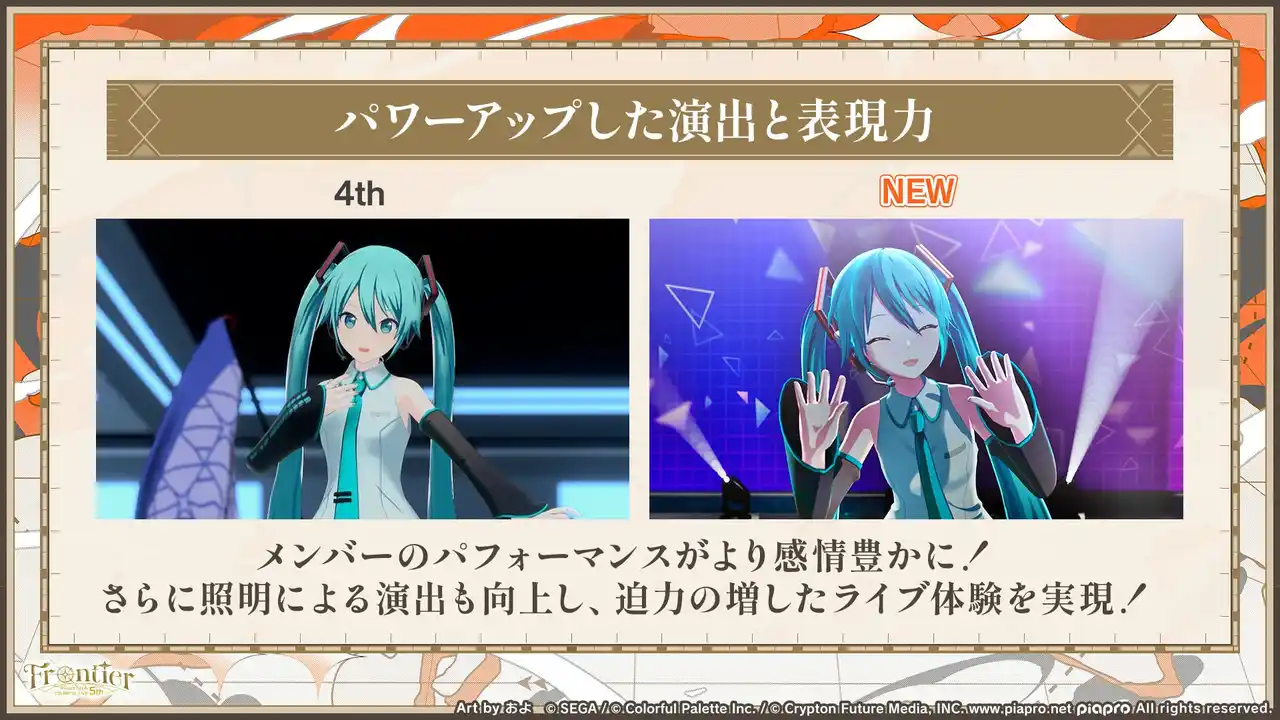 今回のセカライは、ステージがより細部まで丁寧に作り込まれ、MCや楽曲の演出表現も大幅に進化。ビジュアル面もさらに磨きがかかり、キャラクターたちのパフォーマンスや感情表現が一層豊かになったことで、これまで以上に迫力あるライブ体験をお届けします。“新しい領域”に踏み込んだ「Frontier」に、ぜひご期待ください。 |