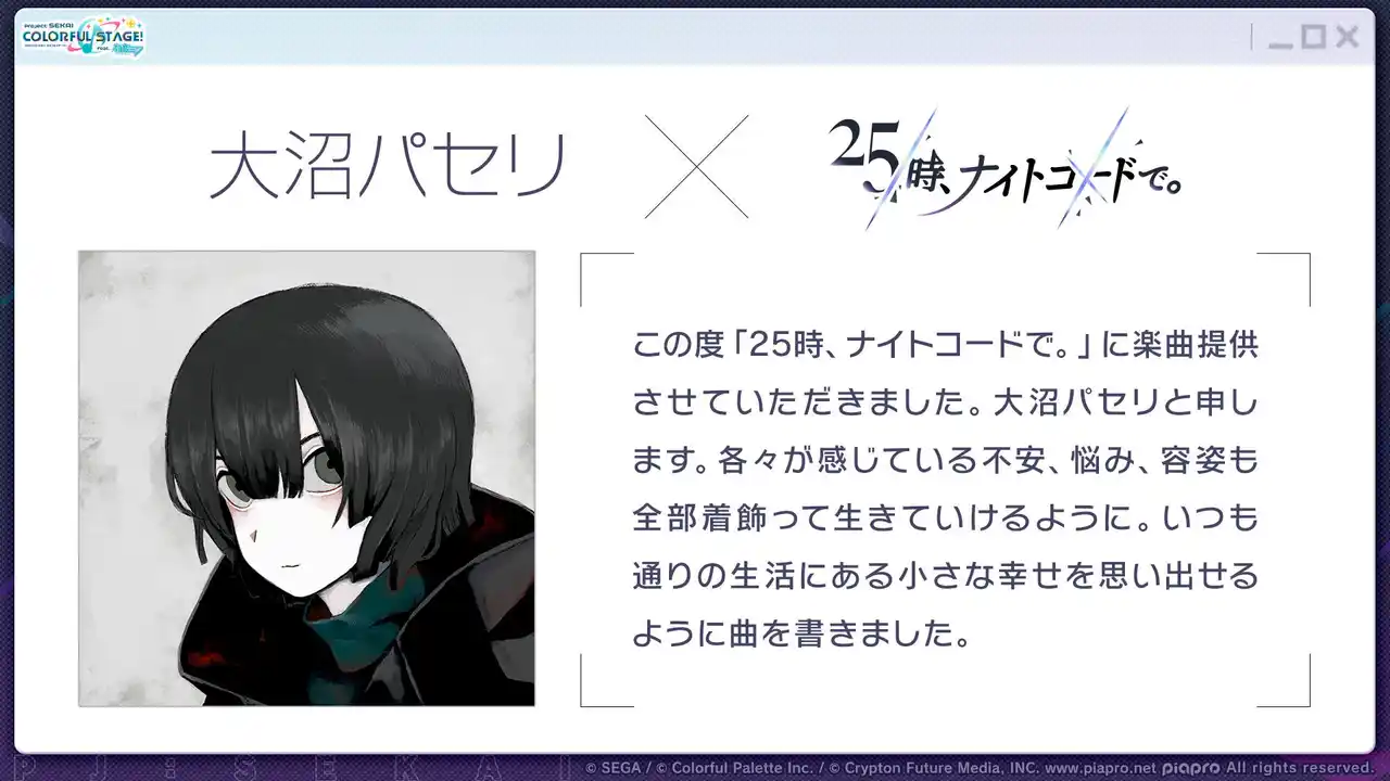 『プロジェクトセカイ』書き下ろし楽曲提供クリエイターとして、吉田夜世さん、大沼パセリさんが参加することが決定いたしました。 |
