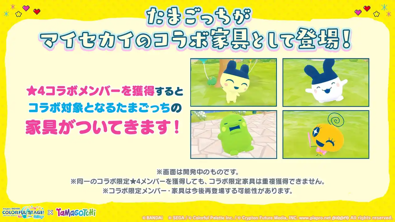 また、本ガチャで獲得した★4コラボ限定メンバーと対応する「たまごっち」が、マイセカイのコラボ家具として登場いたします。 |