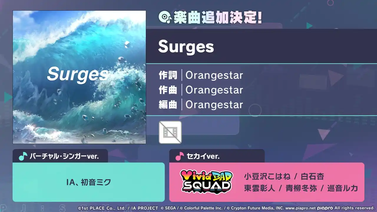 著作権表記:(C) SEGA / (C) Colorful Palette Inc. / (C) Crypton Future Media, INC. www.piapro.net All rights reserved. |
