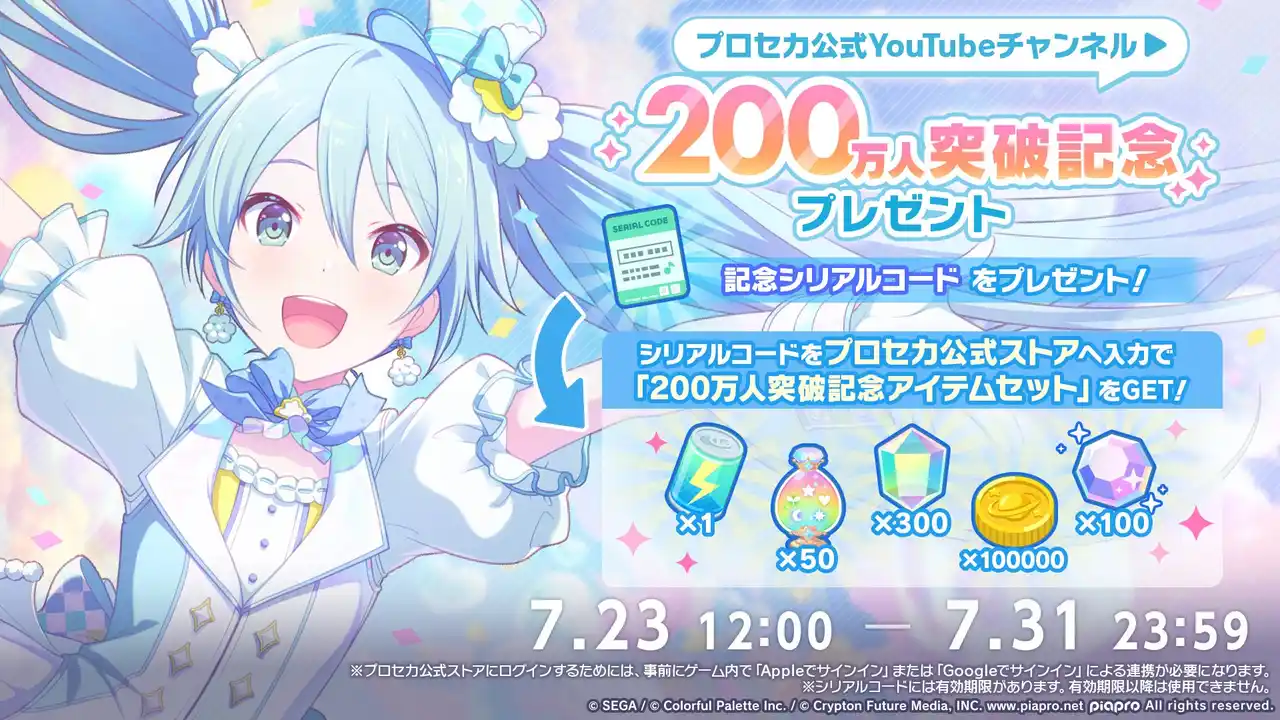 プロセカ公式YouTubeチャンネルの登録者数が200万人を突破した記念として、7月31日(木)23:59までにログインした方に、「ライブボーナスドリンク(大)」×1個、「ミラクルジェム」×50個、「クリスタル」×300個、「コイン」×100,000枚、「想いのカケラ」×100個がセットになった「200万人突破記念アイテムセット」をプレゼントいたします。「200万人突破記念アイテムセット」は、プロセカ公式ストアで記念シリアルコードを入力することで入手することができます。 |