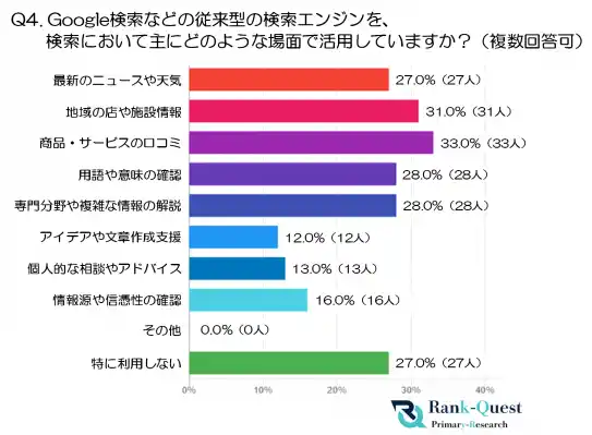 いずれも、店舗の評判や所在地、営業時間など『実用的かつ具体的な情報』を探す場面においては、情報量が豊富で絞り込みもしやすい従来型検索が優位に働いていることがうかがえます。