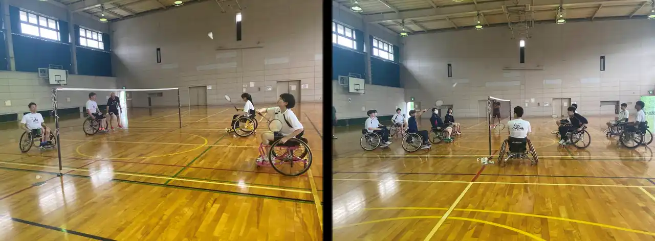 車いすバドミントンの競技では、普段立って行うバドミントンの位置と比べると車いすに座ってプレーをする分ラケットの位置も低く、ネットにシャトルが引っ掛かってしまうケースが多いです。車いすバスケット―ボールと同様に最初は難しそうな生徒たちでしたが、プレーを続けるとすぐに慣れ、楽しそうにラケットを振るう 姿が印象的でした。 |