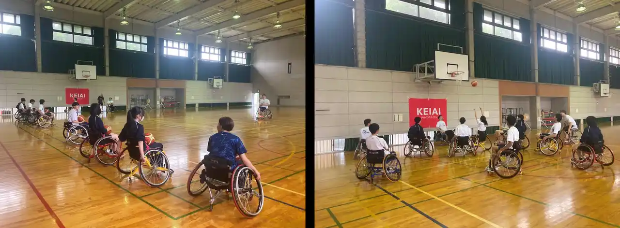 その後実際に競技用車いすに乗ってもらいドリブル練習やシュート練習、生徒全員での試合を体験していただきました。 |