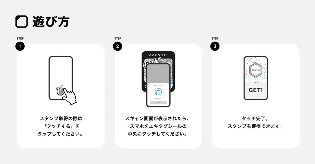 駅などに設置された専用のNFCタグにスマートフォンをタッチすることで、設置場所ごとに違うスタンプをアプリ内のデジタルスタンプ帳で収集することができるアプリサービスです。 |
