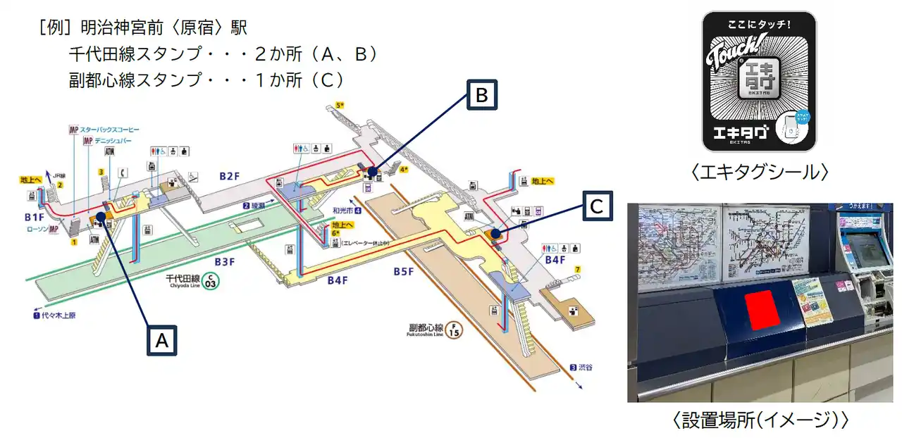 この企画は、東京メトロの駅に設置された専用のエキタグシール(NFCタグのサイン)にスマートフォンをかざすことで、駅ごとに異なるスタンプをアプリ内のデジタルスタンプ帳で収集することが可能です。 |