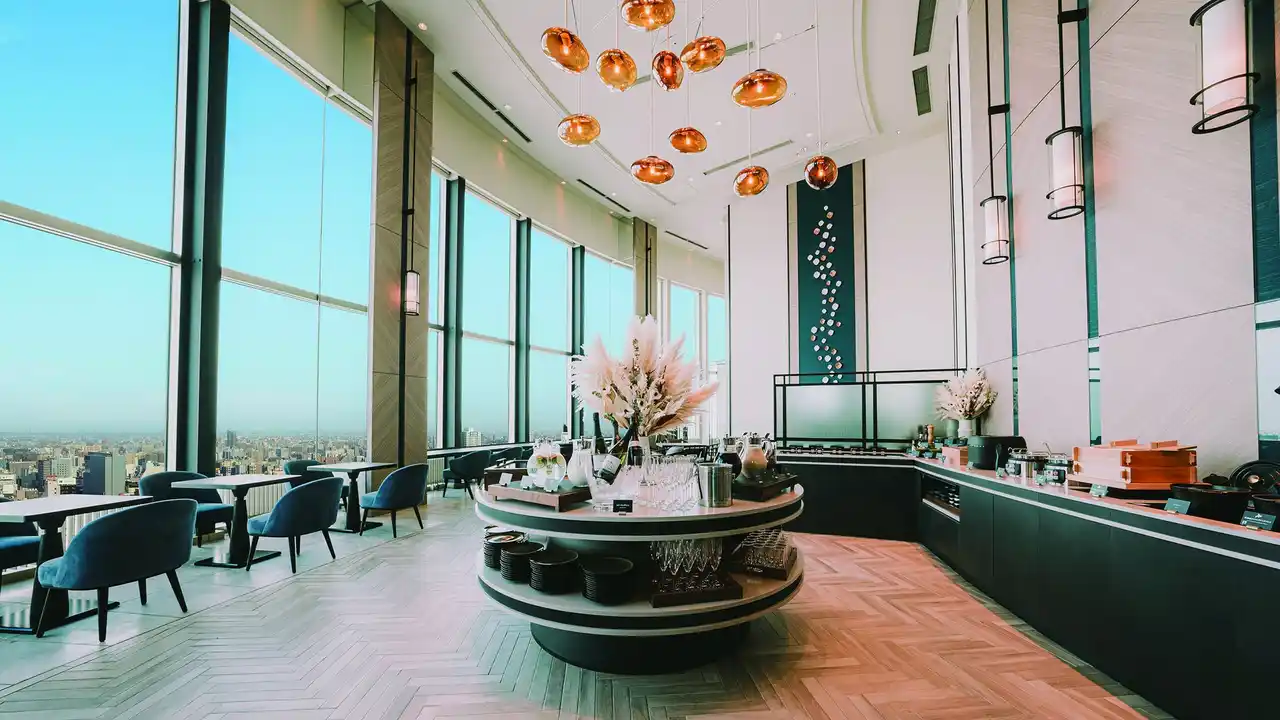 | パティシエ特製お月見パフェ、バーテンダーオリジナル「空色カクテル」 | |||||||||
