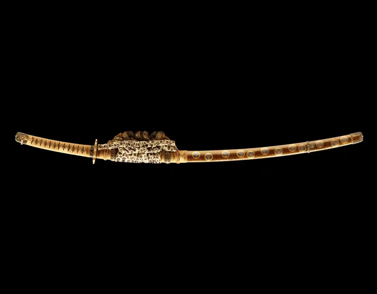 <金梨子地葵紋散金銀蒔絵鞘糸巻太刀拵> |