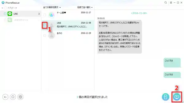 Step4.復旧したいトーク履歴を選択 > 「PCへ」あるいは「デバイスへ」をクリックします。