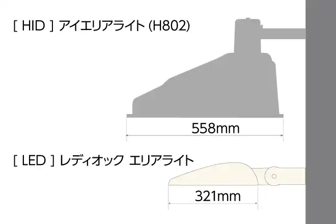 「レディオック エリアライト」は、HID照明器具「アイエリアライト」からの交換に最適な配光のLED投光器です。 器具の後ろ方向と上方向への光を抑え、前方向に広がりを持たせた照明効率の高い配光性能です。 水銀ランプ400Wとアイエリアライトの組合せと比較して約75%消費電力を削減できます。 アームの取付寸法も「アイエリアライト」と同じ寸法のため交換が容易です。 |