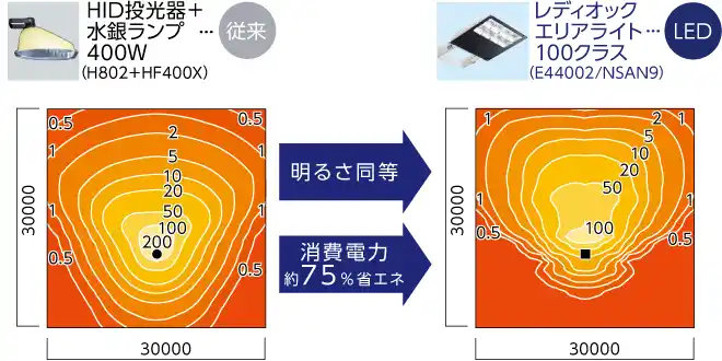 | アイエリアライトと水銀ランプ400Wの組合せと比較し、消費電力を約75%削減しながら平均照度は同等の明るさを実現しています。 | |||||||||