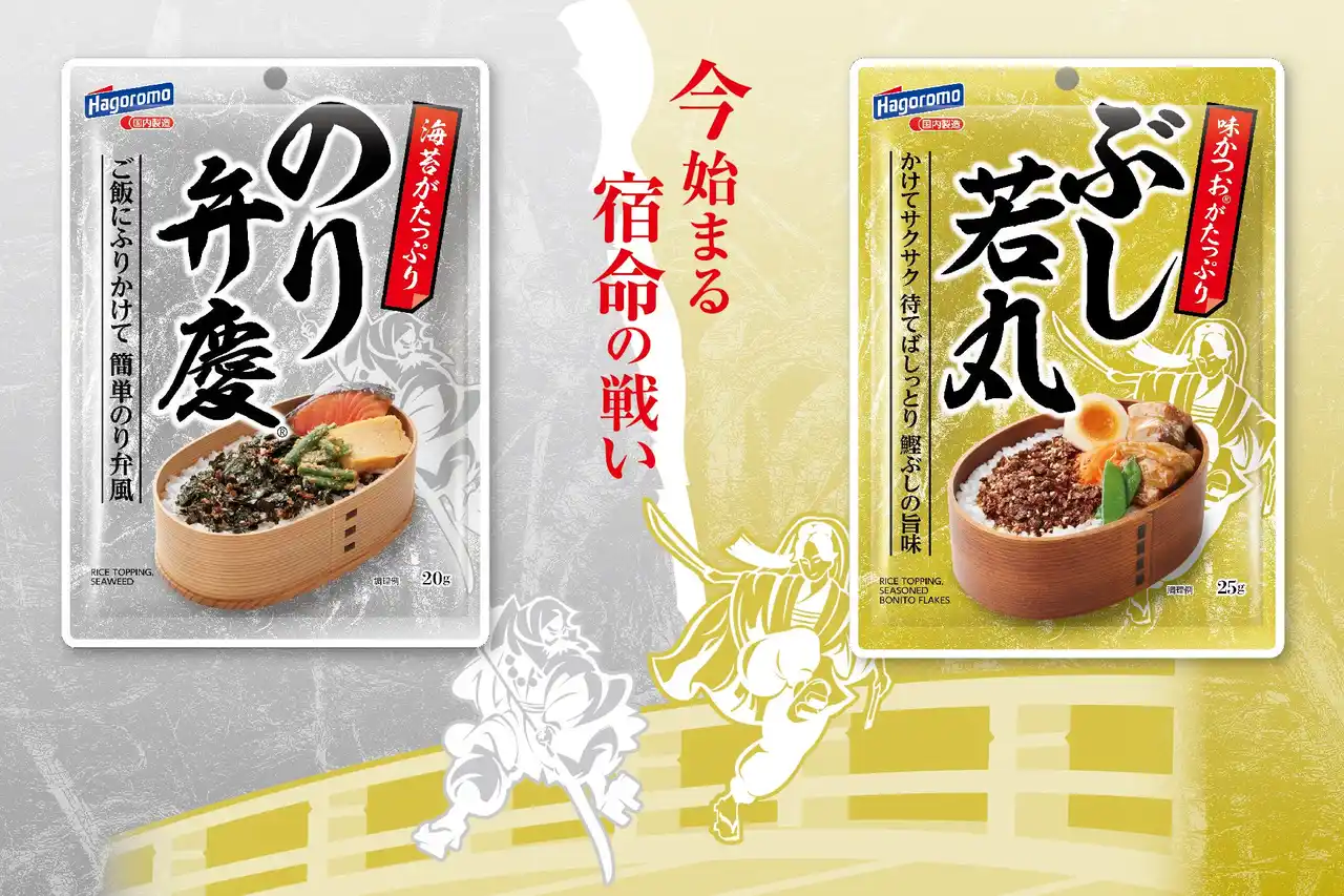 「のり弁慶ふりかけ」はのりをたっぷり使用したふりかけです。今回発売する「ぶし若丸ふりかけ」は、味かつおをたっぷり使用したかつお節本来の旨みを味わうふりかけです。並べてみると一目瞭然。のりと味かつおを、弁慶と牛若丸の戦いからその後の運命になぞらえて、「ぶし若丸ふりかけ」も史実のように「のり弁慶ふりかけ」を超える製品に成長してほしいという願いを込めたネーミングになっています。 |