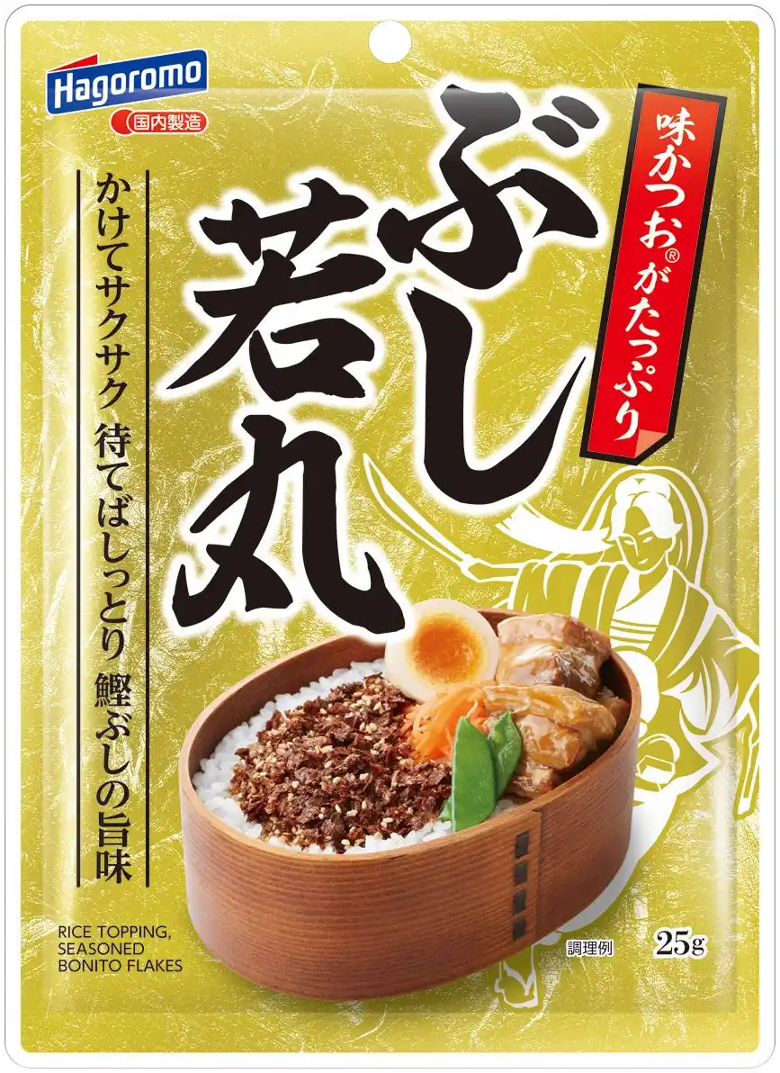 「ぶし若丸ふりかけ」は、当社自慢の“味かつお”をたっぷり使い、かつお節本来のおいしさが堪能できる、食べ応え抜群のふりかけです。顆粒を使わず、当社のふりかけ製品の中で最も“味かつお”を多く配合していることから、かつお本来の旨みも楽しめるふりかけです。 |