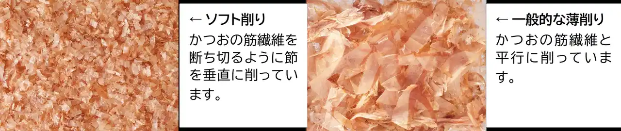 当社自慢の“味かつお”とは、削りたてのソフト削りに特製ダレで味を付け、サクサク食感になるように乾燥させたものです。削りから味付け・乾燥までを一気通貫で製造しているので、香りと食感が抜群です。かつお節は一般的な薄削りではなく、くちどけのよいソフト削りを使用し、甘辛く味付けしているのでご飯との相性も抜群。食べる直前にご飯にふりかけてサクサク感を満喫するのもよし、お弁当にふりかけて、かつお節と絡まった甘辛ダレの風味を楽しむのもよし、お好みでどちらでもお楽しみいただけます。 |