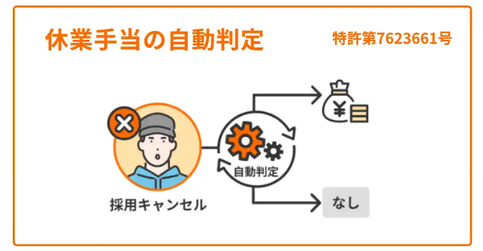 当社は、事業者都合による就業予定の取り消しに対して、労働基準法第26条に基づく休業手当を自動で計算し、休業手当が労働者に自動的に支給される仕組みを導入しています。この仕組みは、特許技術を活用した業界唯一の独自機能です。 |