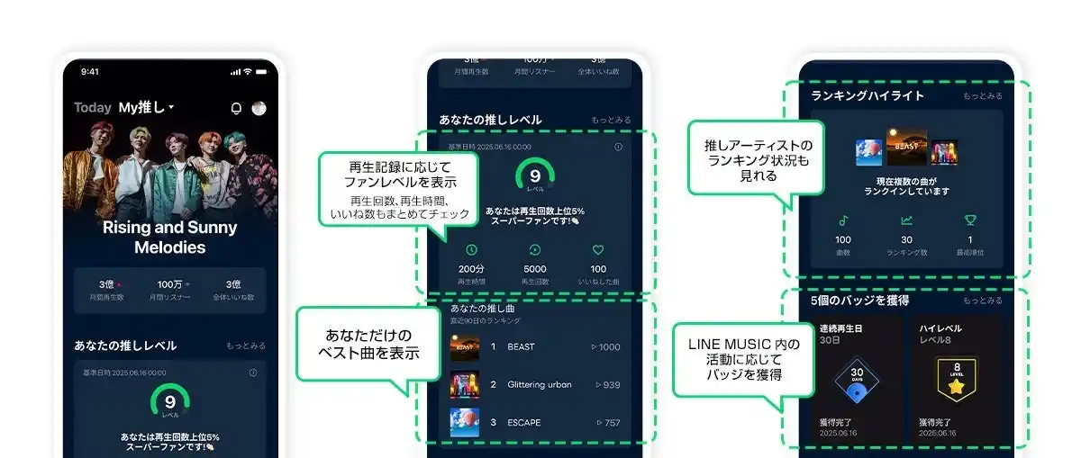 「My推し」では、LINE MUSICアプリ上に推しアーティストの専用スペースを設け、ユーザーの再生履歴から“応援”の積み重ねがひと目でわかる機能や、推しアーティストの再生ランキングを確認できる機能など、ファンの熱量を可視化し、ユーザーが自身の“推し活”を実感できる仕組みを盛り込みました。 |