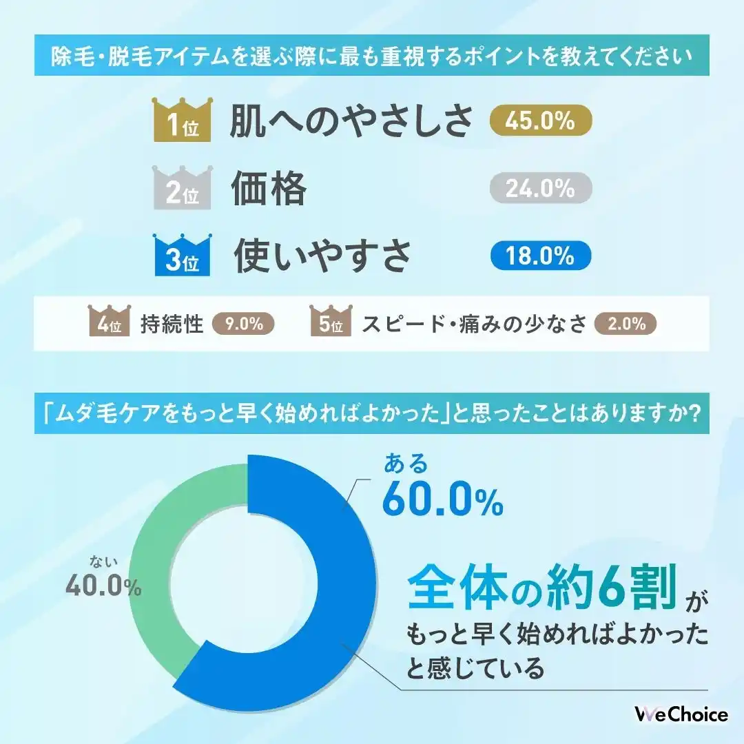 このように、多くの人がムダ毛ケアにおいて「肌へのやさしさ」を第一に、価格・使用感・効果の持続性などをバランスよく見ながら選んでいることがうかがえます。 |