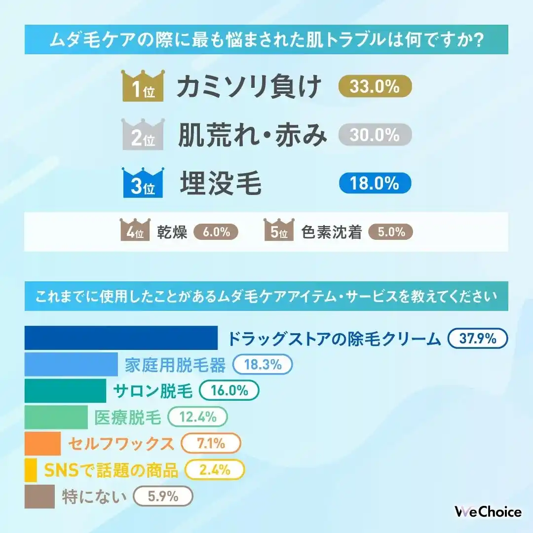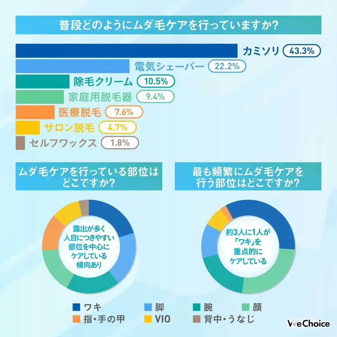 このようにムダ毛ケアの手段は多岐にわたっており、「手軽さ」「仕上がりの美しさ」「コスト感」など、自分のライフスタイルや目的に応じて柔軟に選ばれていることがうかがえます。 |
