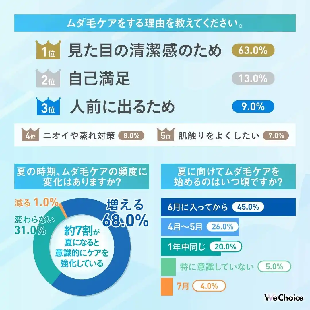 このように、夏はムダ毛ケアへの意識が一年の中でも特に高まる時期であり、多くの人が見た目の清潔感や自己満足のためにケアに力を入れていることがうかがえます。 |