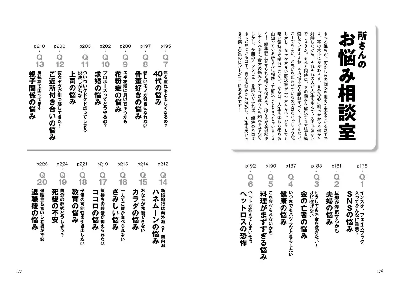 また後半では所さんが読者の皆様の悩みに答えた「お悩み相談室」を収録。SNS、浮気、お金、病気、ペットなどなど全20ものお悩みを所さんが楽しく解決します! |