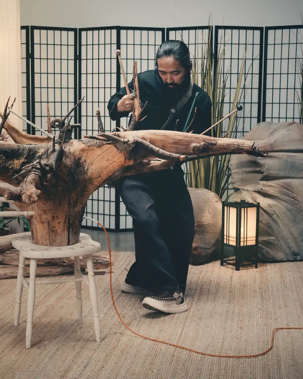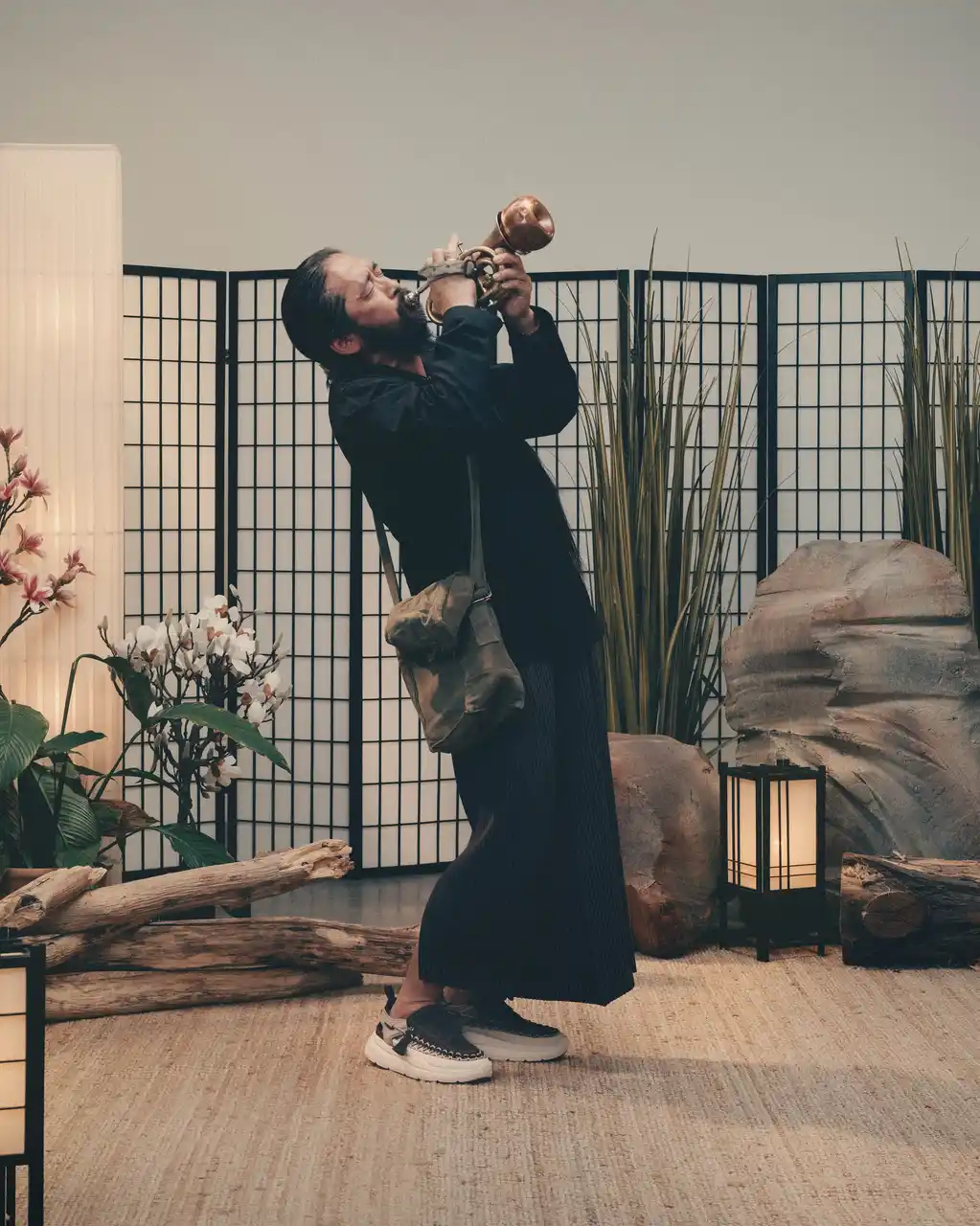 デザインは「相反するものの調和」というコンセプトから着想を得ており、伝統と革新をバランスよく調和させています。また、そのシルエットには東洋の歩行瞑想や編み込み靴の職人技からのインスピレーションに、現代的なテクノロジーとミニマルな美学を融合させています。精神的な深みと最先端の機能性の両面を併せ持つデザインアプローチは、「意識的に歩く」という行為の心と身体、両方の側面を表現しています。 |
