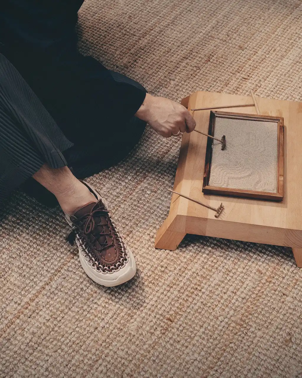 落ち着いた色彩とシームレスなラバー製マッドガードが、クリーンかつアウトドア調の仕上がりを実現。タッセルやリブ状のシューレースチップは、瞑想の所作を想起させるディテールとして、デザインに深みと象徴性を添えています。 |