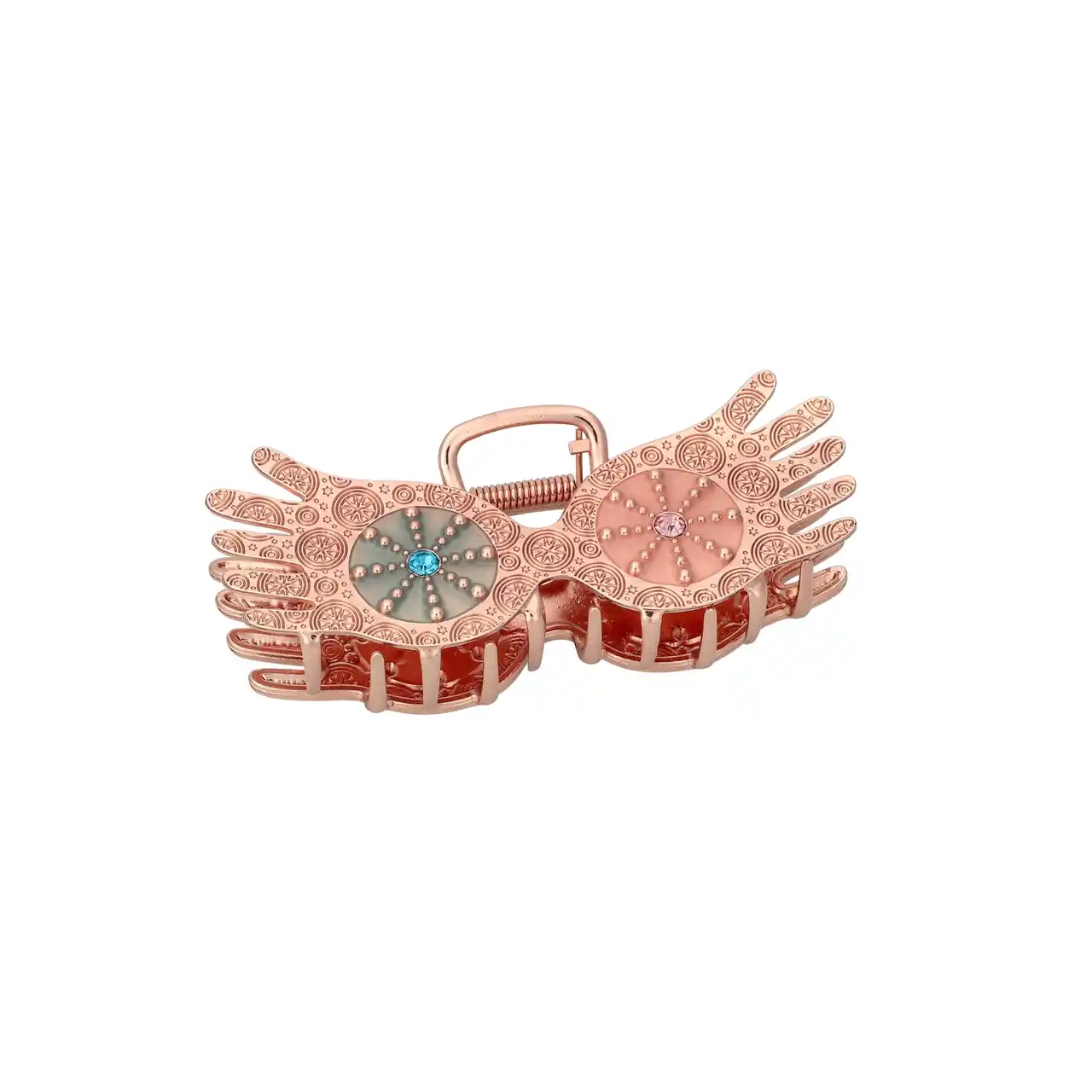 巾着型のトートバッグは、映画『ハリー・ポッターと不死鳥の騎士団』の作中に登場するルーナのスニーカーのデザイン部分を刺繍やラバープリントなど、さまざまな仕様を組み合わせて表現しています。巾着を絞って紐を蝶々結びにするとスニーカーの紐を縛っているように見えるユニークな仕様や、内側の総柄デザインなど、細部までこだわりの詰まったアイテムです。 また、ピンクゴールドのボディにラインストーンをあしらった、メラメラメガネデザインのヘアクリップが登場します。ピンクゴールドが放つ輝きと、ルーナが好む個性的なデザインはコーディネートのアクセントにぴったりです。 |