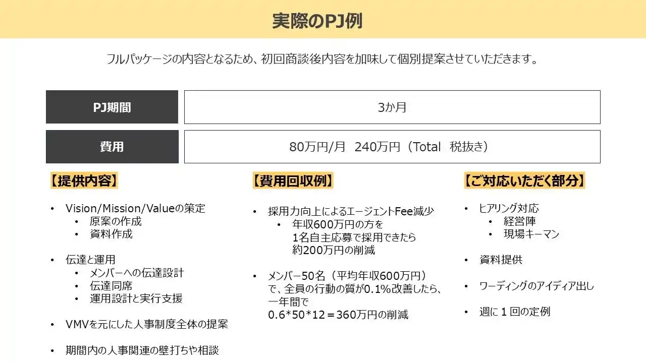 経営課題を人と組織の視点から再定義し、ビジネスを深く理解した上で、実行可能な人事戦略を設計・伴走します。採用・制度・カルチャーまで一貫して扱うことで、戦略的に“市場で勝てる組織”をつくるサポートをさせていただきます。 |