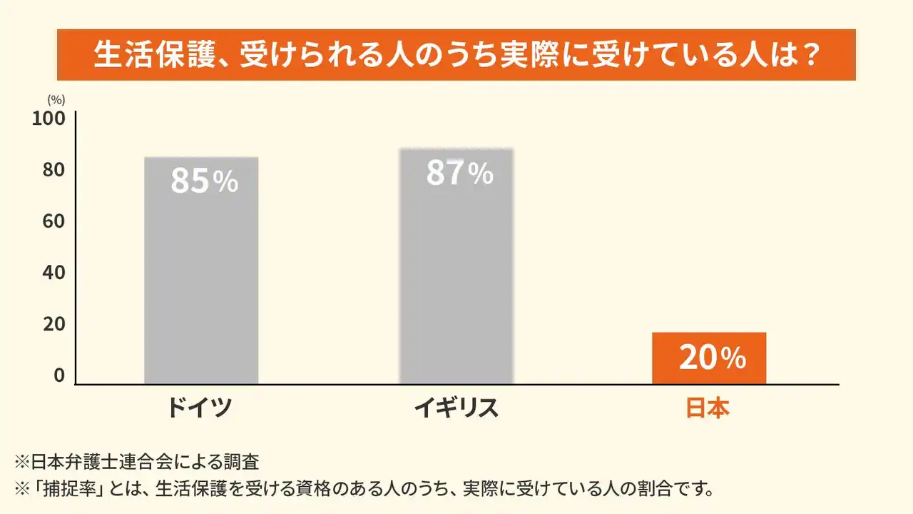 2024年の生活保護申請件数は25万5897件と5年連続で増加し、現行調査手法開始以降で最多を記録するなど、セーフティネットへの需要が高まっています。しかし、研究者の試算によると、生活保護の利用資格がある人のうち実際に制度を利用できている人の割合(捕捉率)は、わずか2~3割程度にとどまっており、諸外国の8~9割という水準と比較して極めて低い状況です。 |