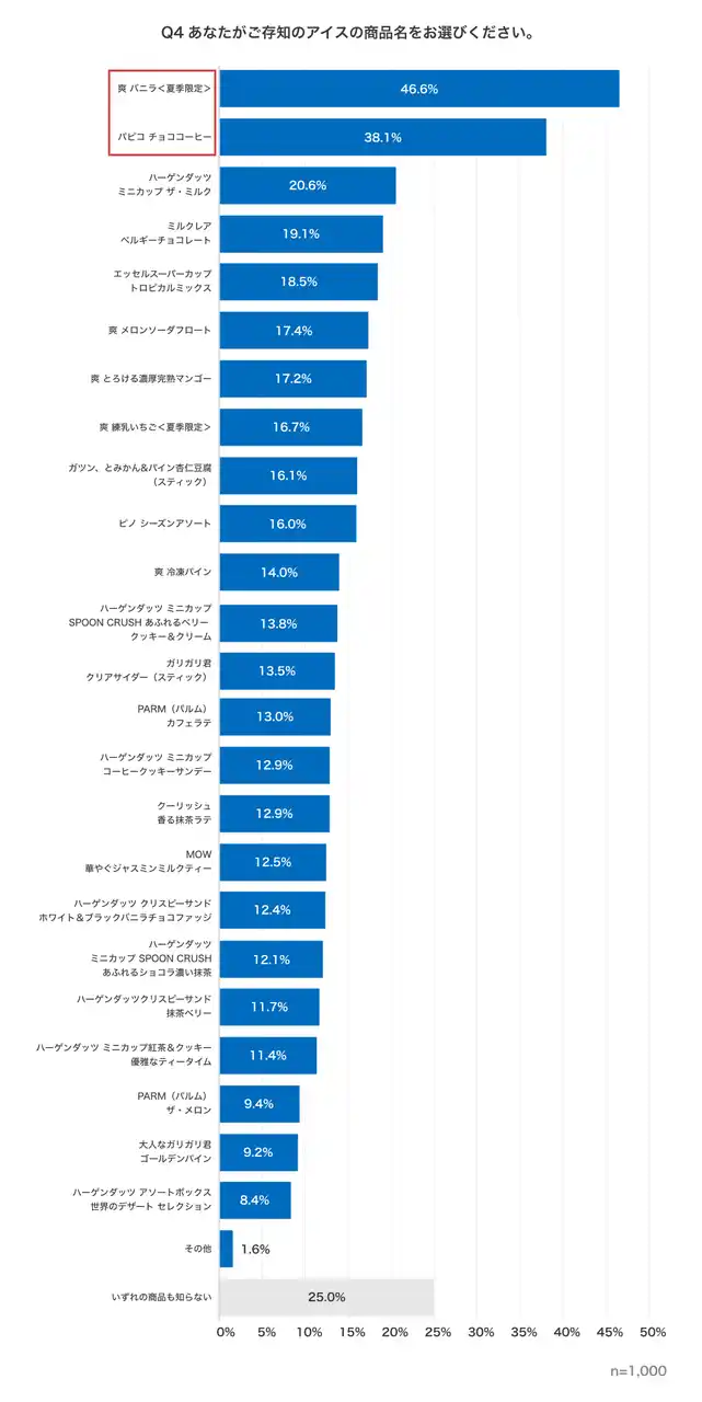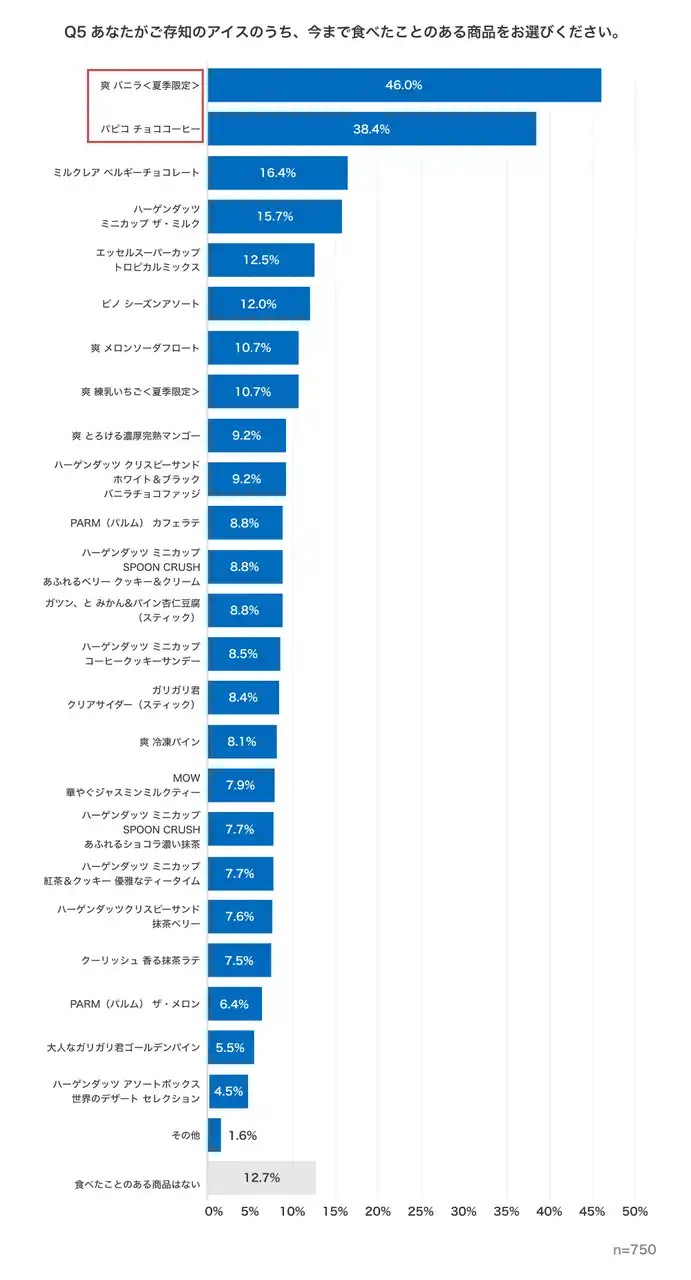 ■【アイスの認知率・喫食経験率】「爽 バニラ<夏季限定>」「パピコ チョココーヒー」が突出して高く、3位以下を大きく引き離す