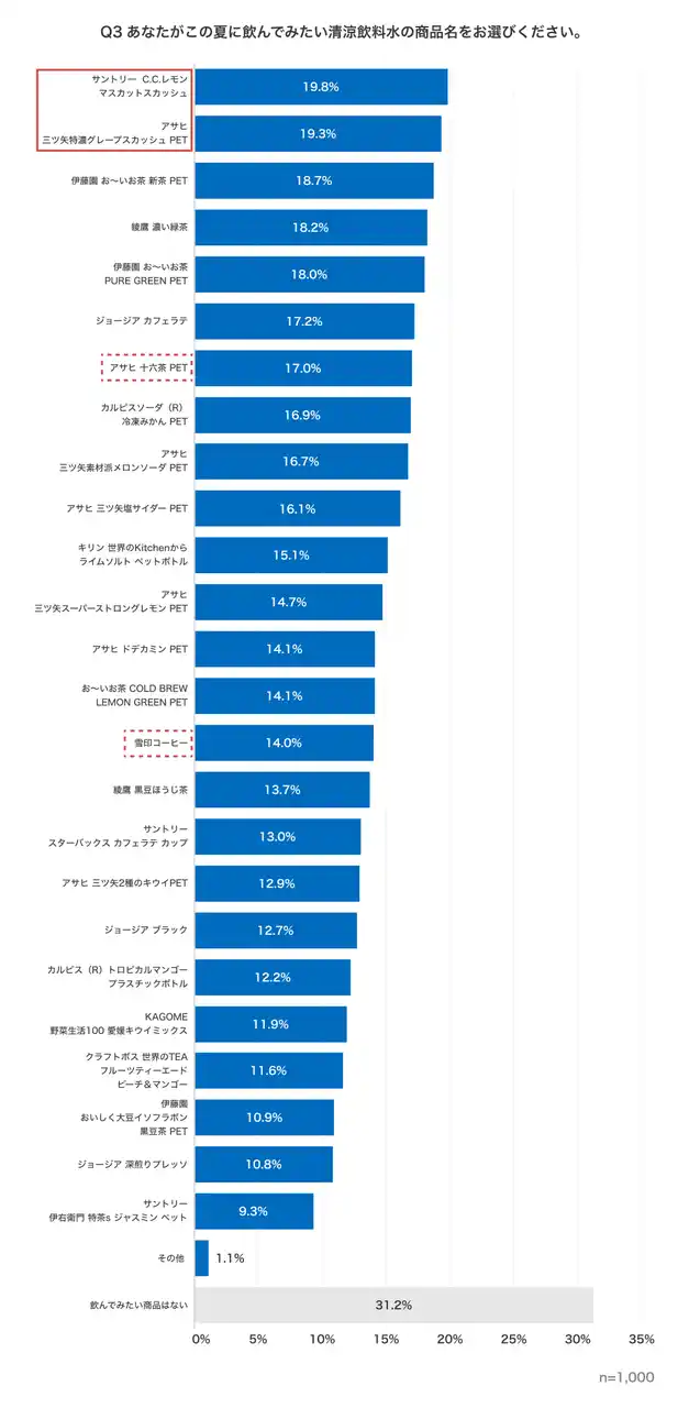 この夏に飲んでみたい清涼飲料水の商品名を聞いたところ、飲用意向率が最も高いのは「サントリー C.C.レモン マスカットスカッシュ」(19.8%)で、「アサヒ 三ツ矢特濃グレープスカッシュ PET」(19.3%)が続く結果でした。 |