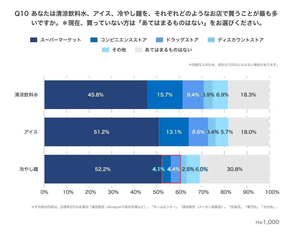清涼飲料水、アイス、冷やし麺を、それぞれどのようなお店で買うことが最も多いかを聞いたところ、最頻購入チャネルは、3カテゴリーともに「スーパーマーケット」がほぼ5割で圧倒的に高い結果でした。清涼飲料水とアイスでは、「コンビニエンスストア」が1割台、「ドラッグストア」が1割弱で続きました。冷やし麺のみ、0.3ポイントの僅差ながら、「スーパーマーケット」に続いて「ドラッグストア」(4.4%)が「コンビニエンスストア」(4.1%)を上回っています。 |