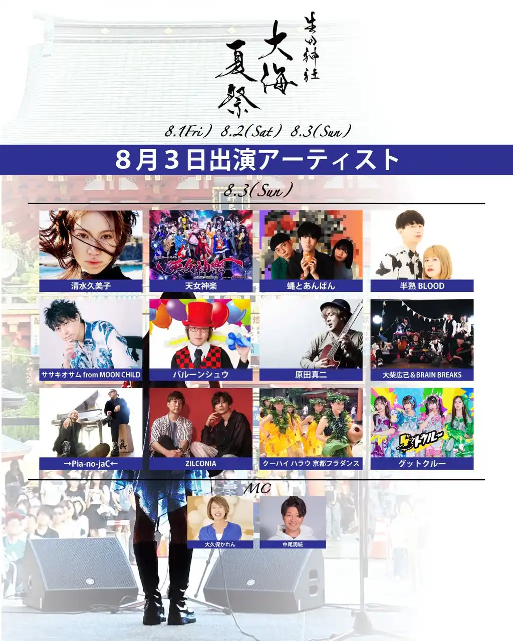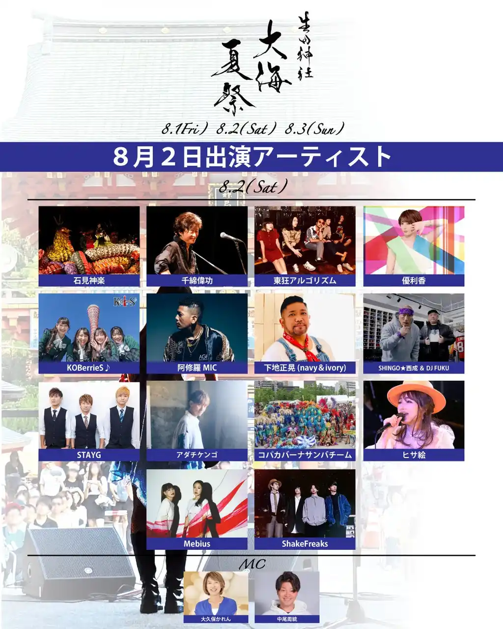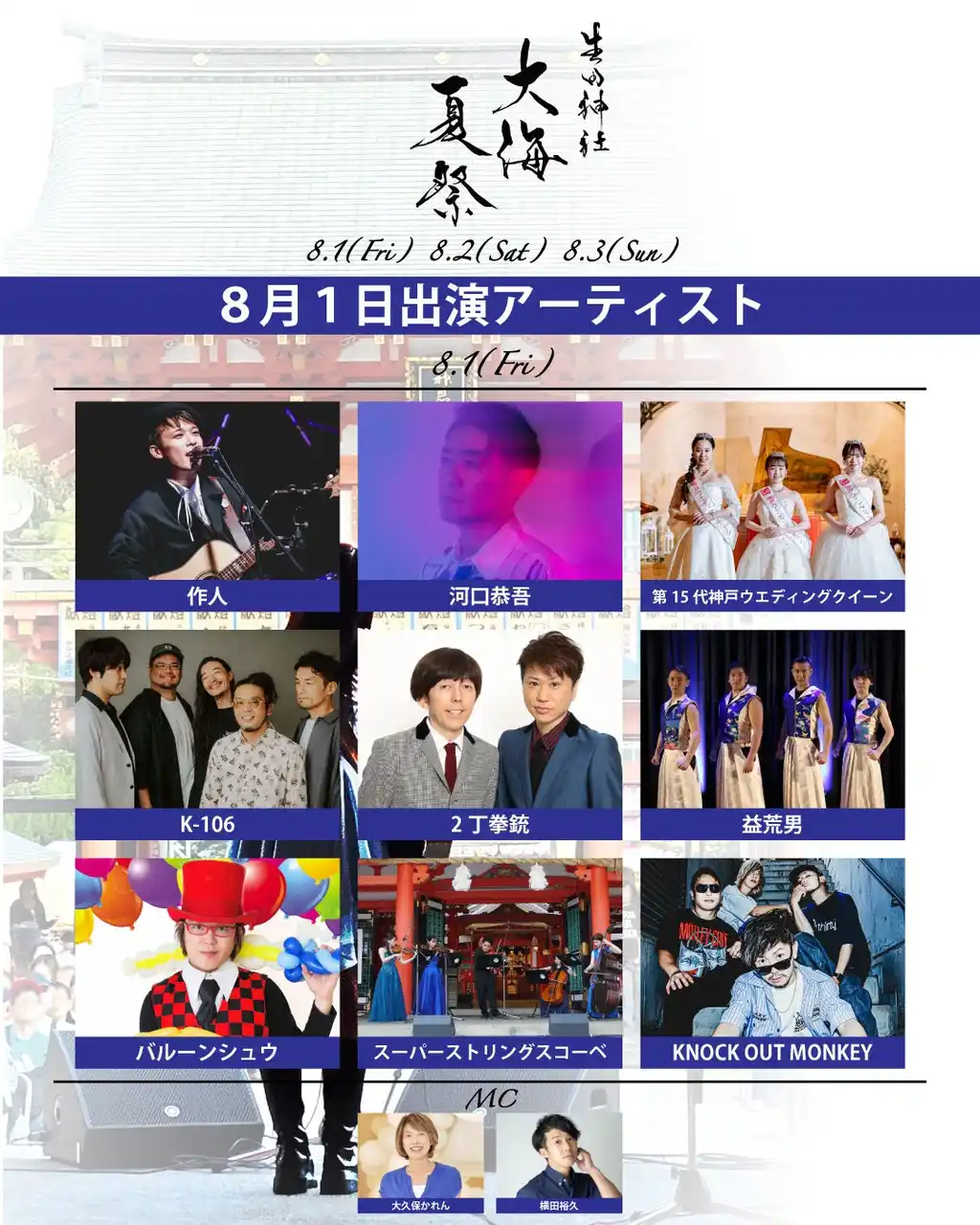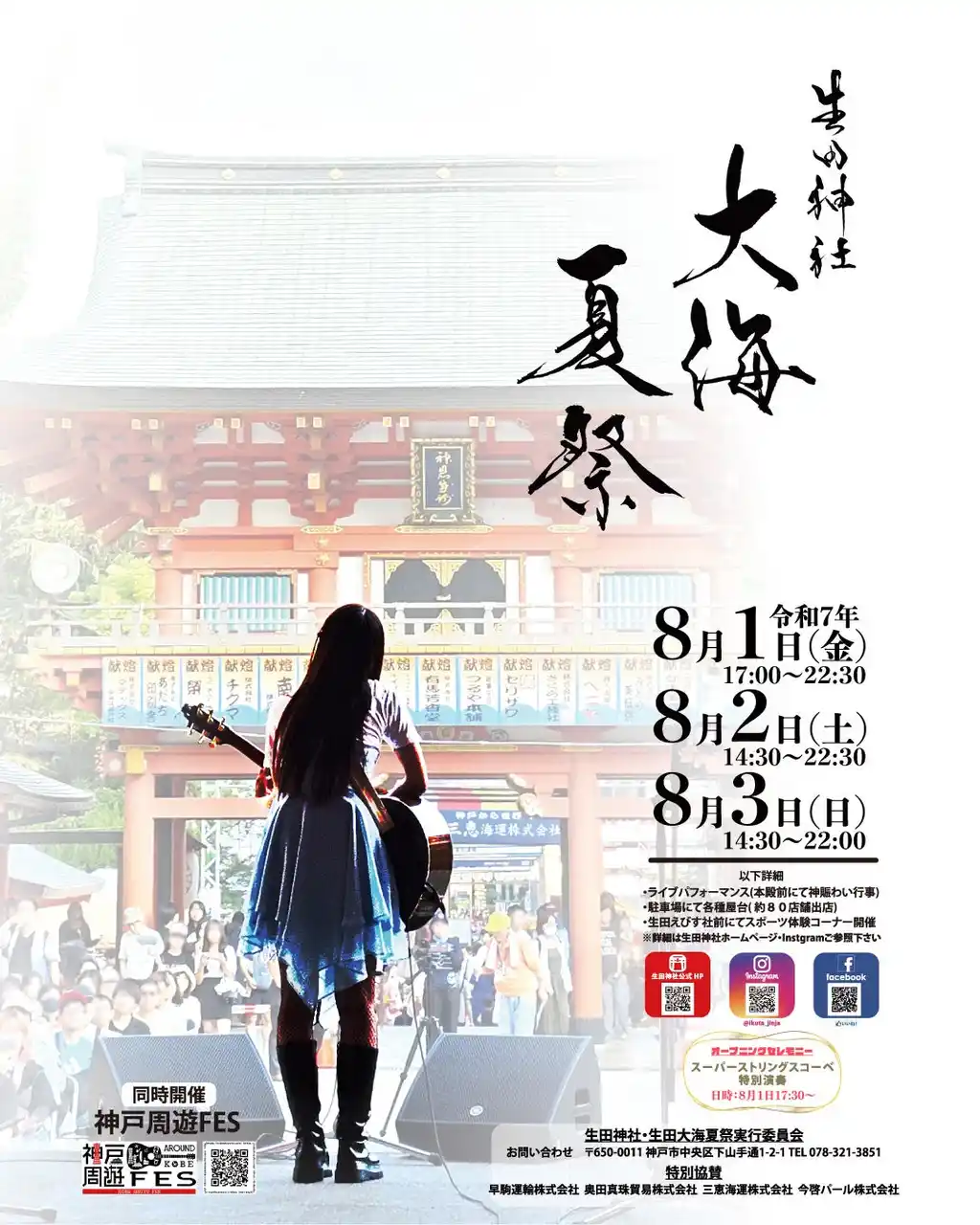 境内南側に御鎮座し、海運守護、道開き、交通安全の神、猿田彦命を祀る生田神社の末社、大海神社の令和7年の夏祭を3日間にわたり開催致します。 期間中、拝殿前の特設ステージにて音楽ライブを実施。和太鼓などはもちろん、ジャズ、サンバなど連日繰り広げられます。 屋台も出店します。