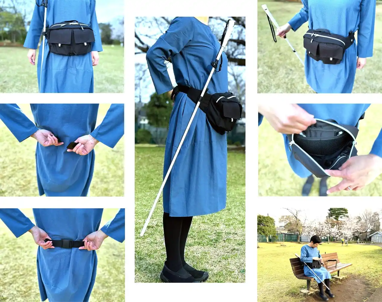| 視覚障がい者の外出をサポートするウエストポーチの製品化。磁石を使ったアイデアで、白杖をポーチに「ピタッ」と吸着!両手が自由になり、スマホ操作・買い物・手洗いが楽になる新しいグッズです。 |