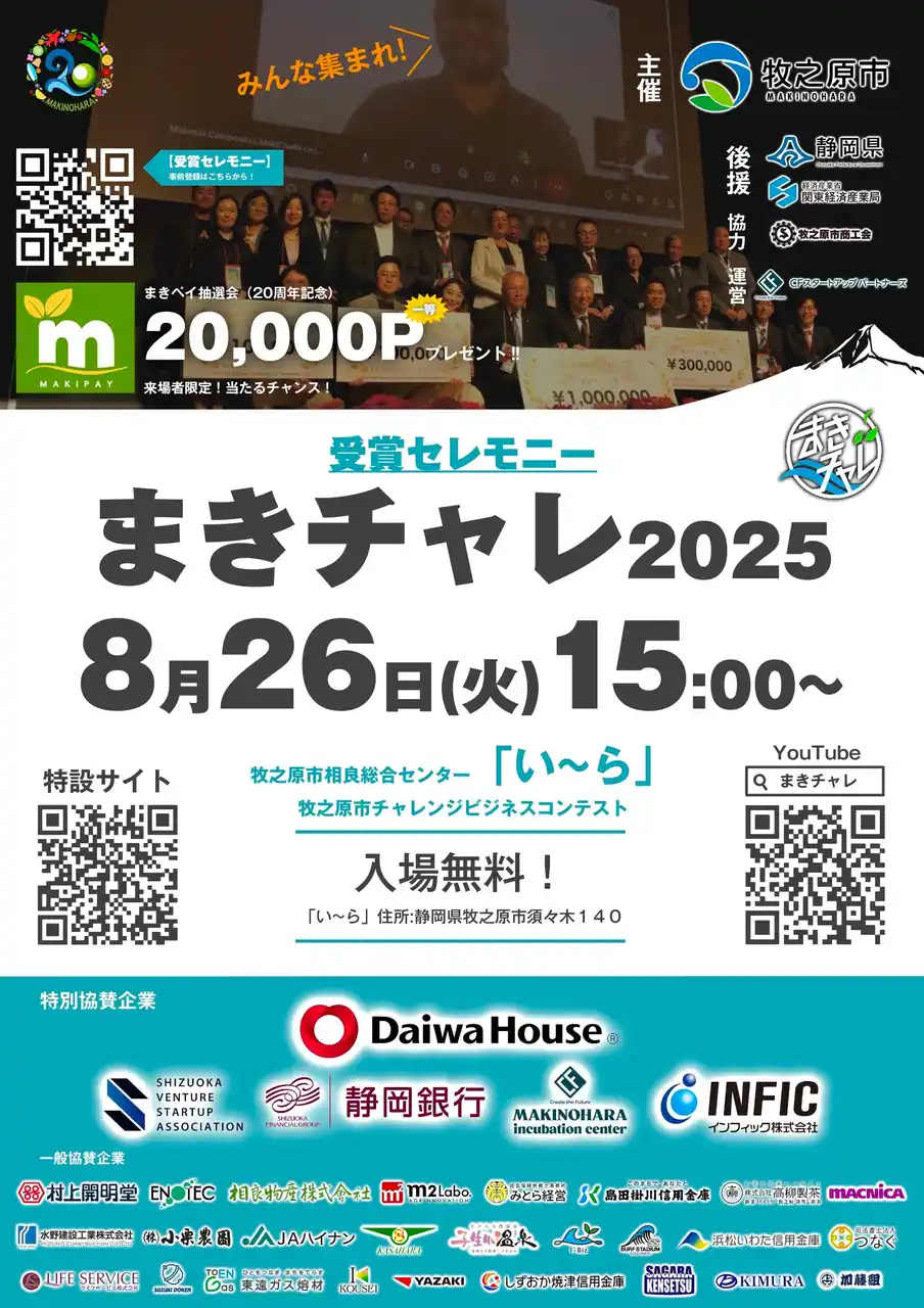 牧之原市チャレンジビジネスコンテスト(まきチャレ)は、地域の産業・観光とコラボするビジネスプランを全国・全世界の*スタートアップから募るユニークなオンラインピッチイベントです。2022年に第1回を開催、今年は4回目となります。今年は牧之原市政20周年を記念し、大賞の賞金は前年の2倍となる【200万円】を贈呈。協賛企業として、大和ハウス工業、静岡ベンチャースタートアップ協会、静岡銀行、インフィック株式会社ほか、地域有力企業26社が参加。スタートアップの応募総数は168社(うち海外73社)にのぼり、国内最大規模の地域オープンイノベーションイベントとなります。 |