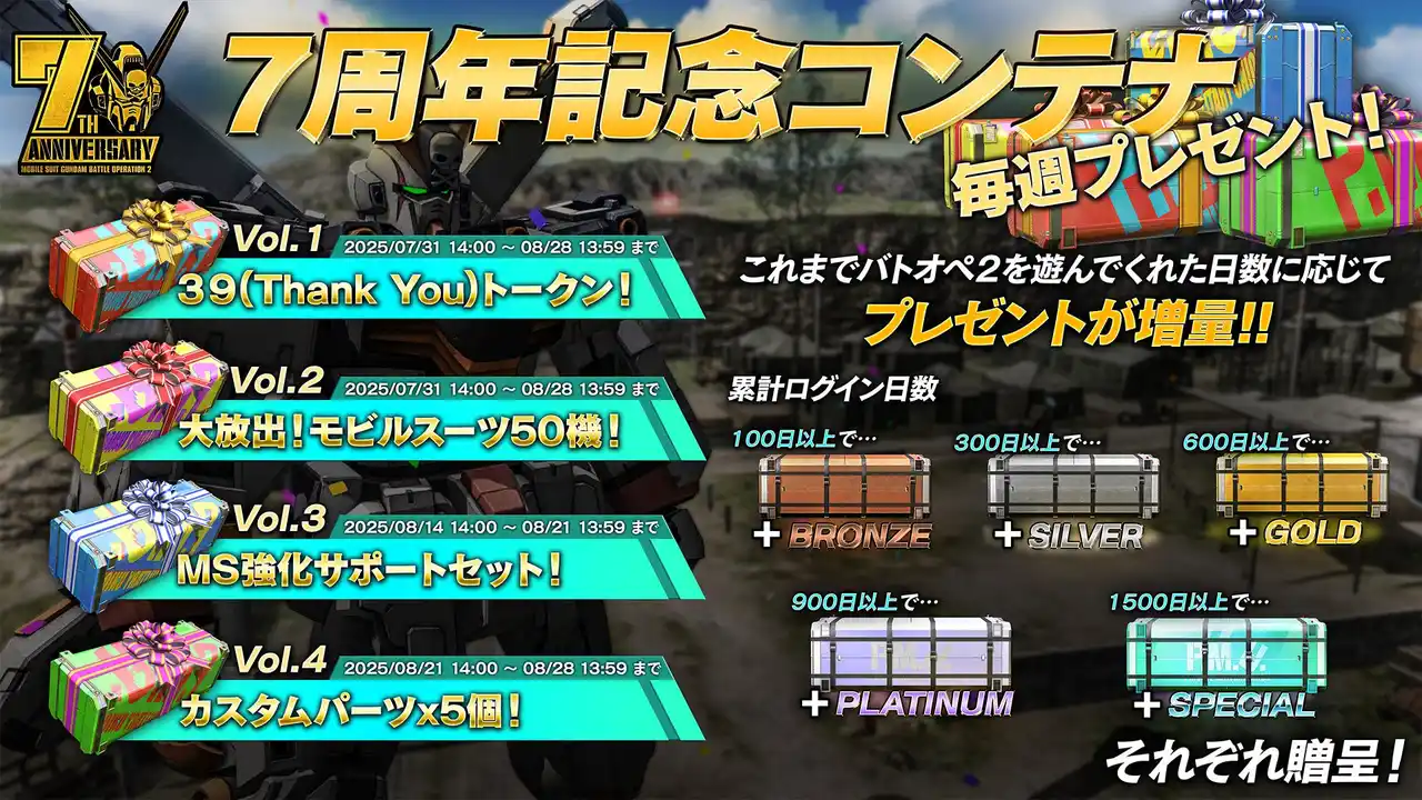 感謝の『39トークン』や50機体などが貰える! 7周年記念コンテナを毎週プレゼント! |