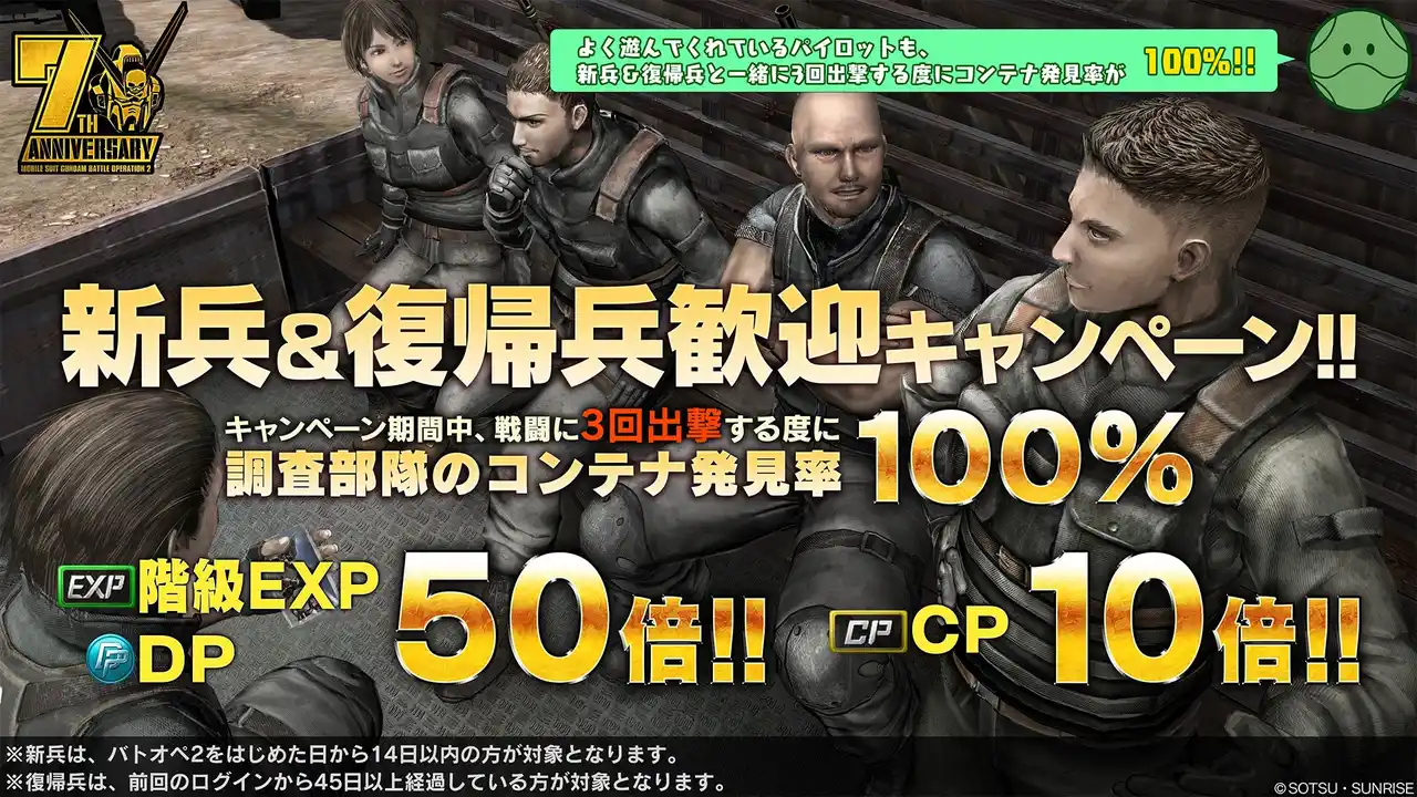 『バトオペ2』をはじめた日から14日以内の新兵と、バトオペ2に45日以上ログインしていなかった復帰兵限定で、EXPとDPが50倍、CPが10倍に上昇する「新兵&復帰兵歓迎キャンペーン」も実施中! |