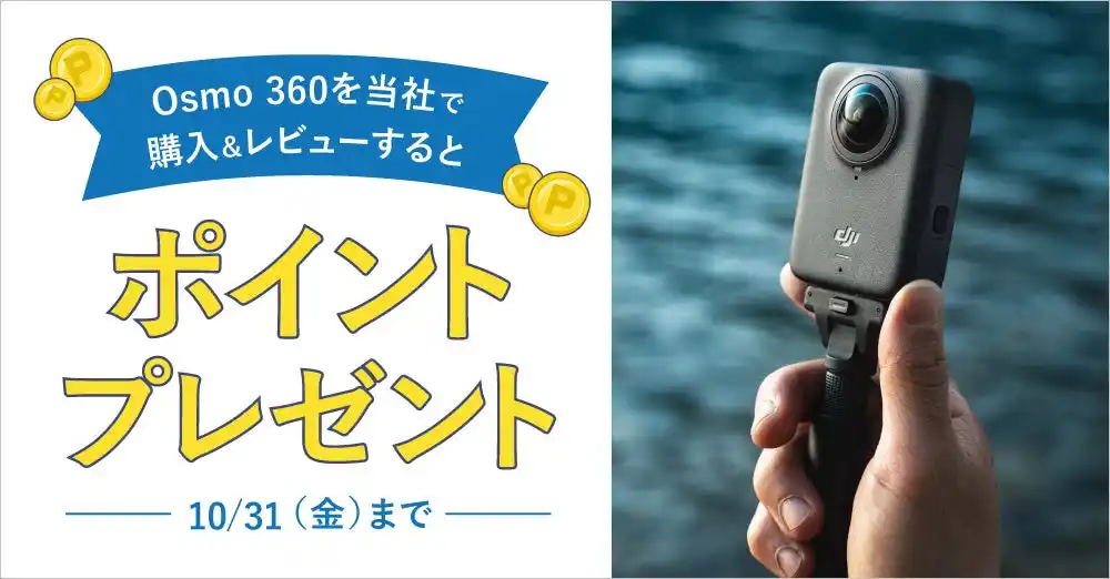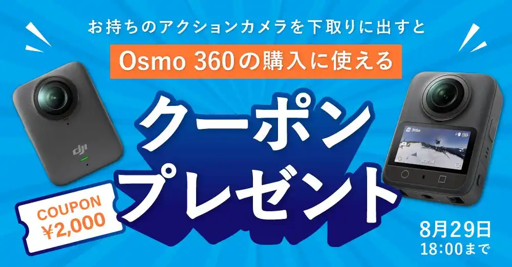 対象メーカーのアクションカメラ製品・360°カメラ製品の中古買取査定をお申し込みいただくと、新製品「Osmo 360」をおトクにお求めいただける特別クーポンをもれなくプレゼントいたします。 |