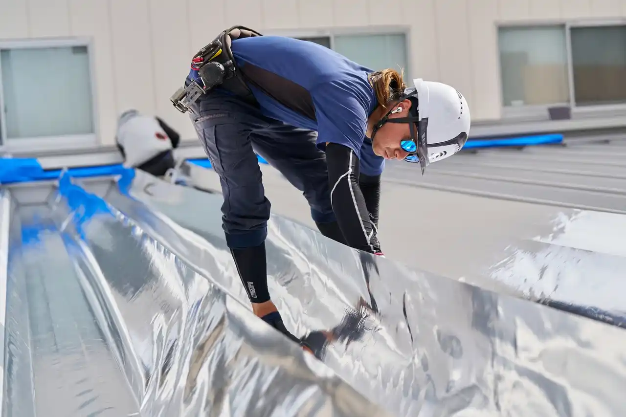 当社では屋根の遮熱対策に力を入れています。写真は屋根職人が遮熱シートを施行している様子です。 |