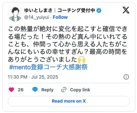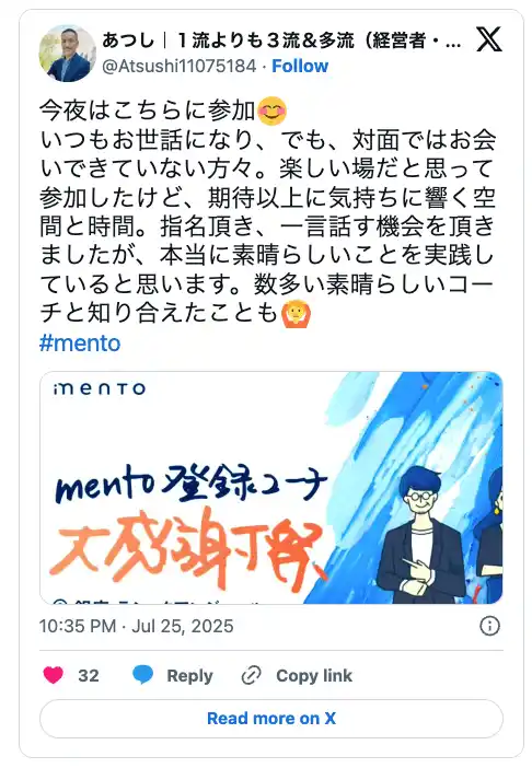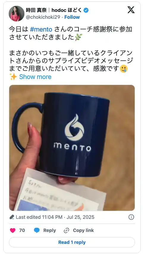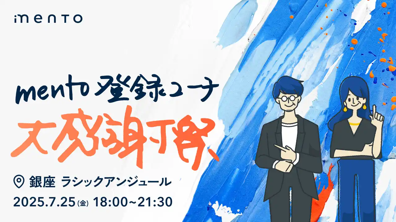 管理職コーチ「mento(メント)」を提供する株式会社mento(本社:東京都渋谷区、代表取締役:木村憲仁、以下mento)は、2025年7月25日(金)に「mento登録コーチ大感謝祭」を開催したことをお知らせいたします。 |