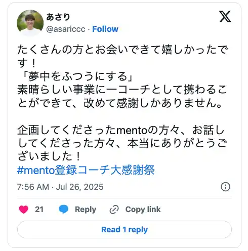 mentoはこれからもmento登録コーチの皆さまと一緒に、一人ひとりのクライアントの心に火を灯し、「夢中をふつうにする」挑戦を続けてまいります。 |
