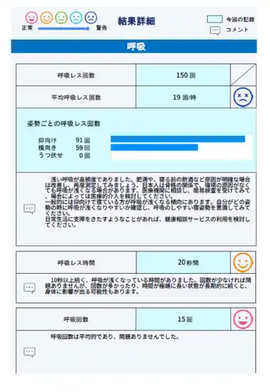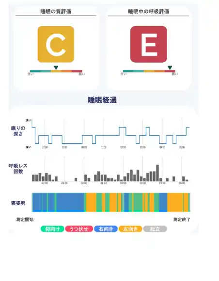 | レポートは、睡眠の深さや姿勢、呼吸の状態などを可視化し、A~Eの5段階で評価が行われ、個別コメントも自動で掲載されます。 | ||||||||||