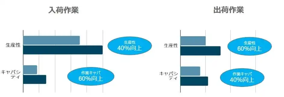 | 入荷プロセスにおいては、生産性(*1)が40%向上、作業キャパシティが60%向上(*2)。出荷プロセスにおいては、生産性60%向上、キャパシティ40%向上という結果が出ています。 | |||||||||