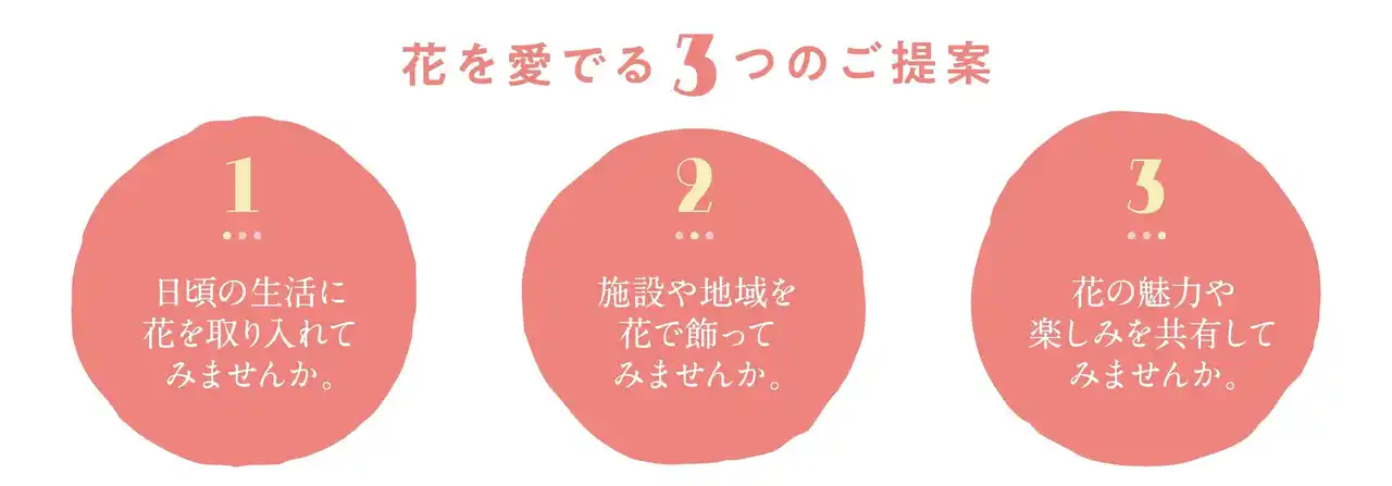県民の皆さんや企業・団体、自治体などあらゆる方々が、さまざまな場面で花を飾り、育て、見て伝えるなど、花を愛でる生活や活動を通じて、ふくしまならではの花を理解し、花に囲まれた豊かで心穏やかな日常を送り、花で飾られた空間で住む人や訪れる人が感動と安らぎが得られるよう、花に親しむためのスタイルや活動を提案します。 |