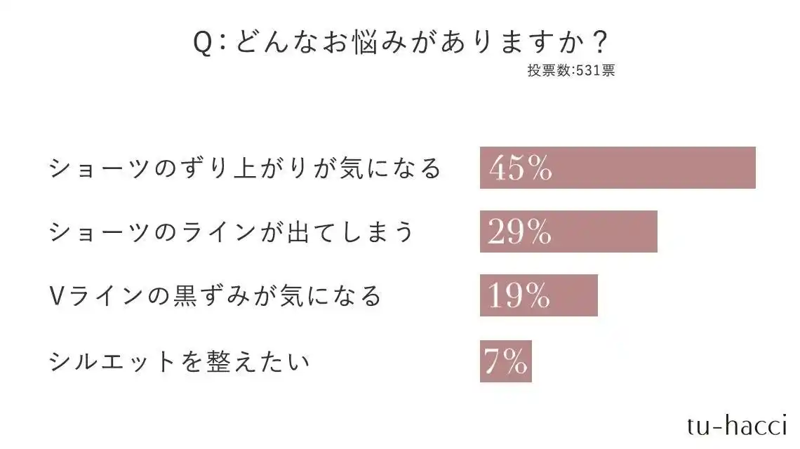 45%の人が「ずり上がりが気になる」、29% の人が「ショーツのラインが出てしまう」、19%の人が「Vラインの黒ずみが気になる」、7%の人が「シルエットを整えたい」ことに悩んでいると回答しました。皆様も経験したことがあるお悩みではないでしょうか。そこで、そのようなお悩みをお持ちの方におすすめしたい、tu-hacciの高機能ショーツをご紹介いたします。 |