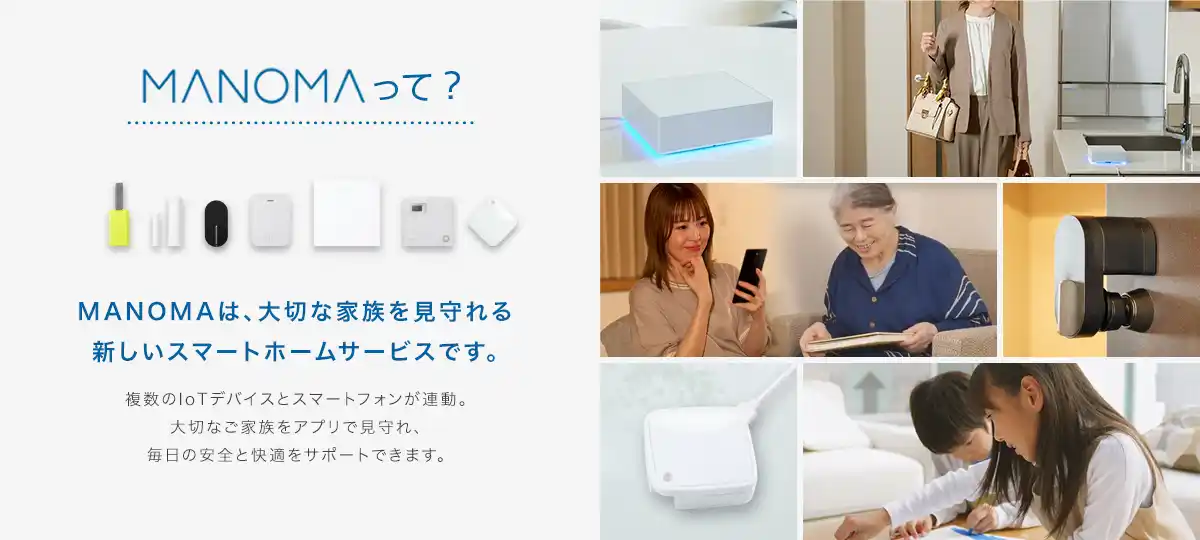 「MANOMA」は、複数のIoT機器とスマートフォンアプリを組み合わせることで、離れていてもご家族を見守り、快適な生活をサポートできる見守りサービスです。室内コミュニケーションカメラによる映像見守りや、空調の遠隔コントロール、開閉センサーでの生活リズム推察、スマートロックによる施錠忘れ対策など、在宅介護の安全性と利便性を高めることが可能です。 |