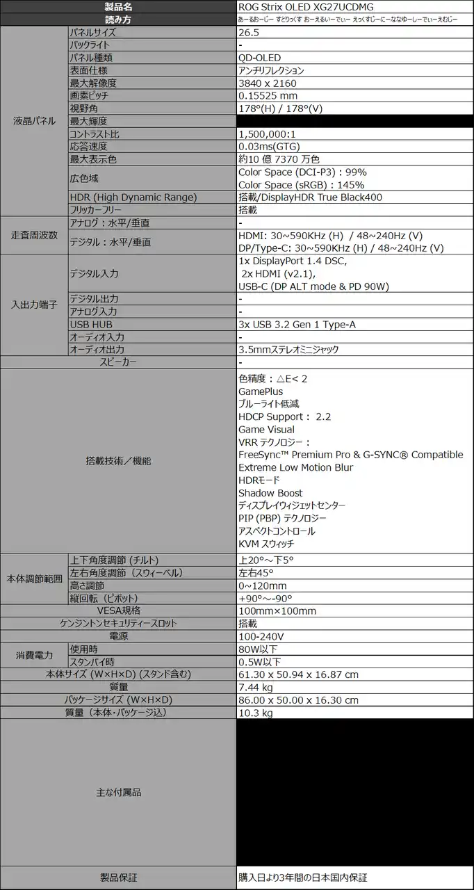 ROG Strix OLED XG27UCDMG:https://rog.asus.com/jp/monitors/27-to-31-5-inches/rog-strix-oled-xg27ucdmg/