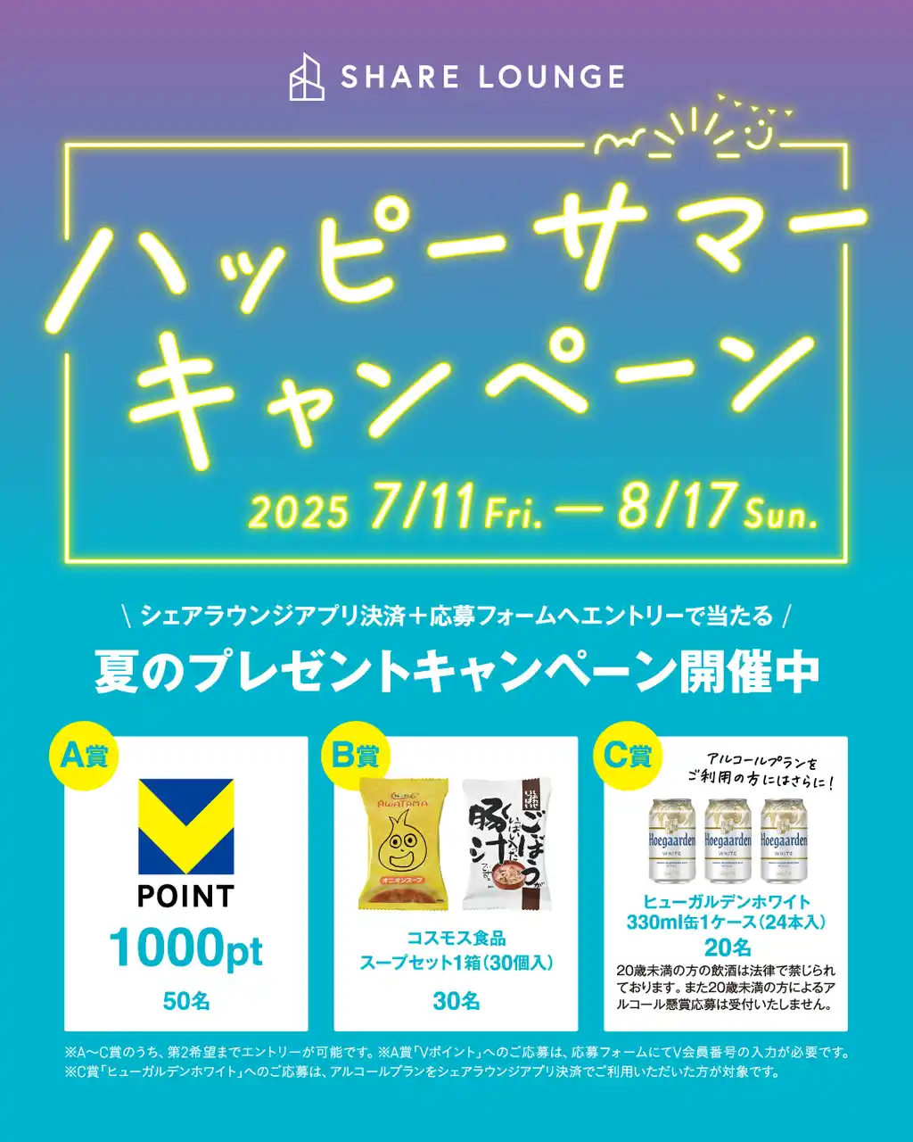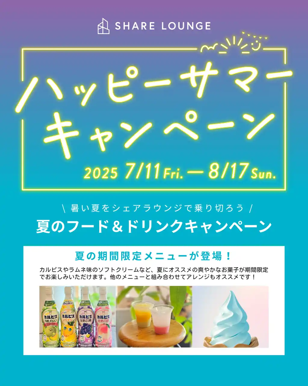 ※詳細はHP( https://www.sharelounge.jp/news/campaign-happysummer250711 )をご確認ください。 |